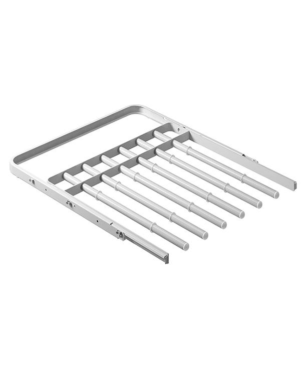 Брючница оснащена трубой диаметром 16 мм, рассчитанной на 6 пар брюк, и легко устанавливается между двумя вертикальными стойками на кронштейны глубиной 435 мм — без использования инструментов.