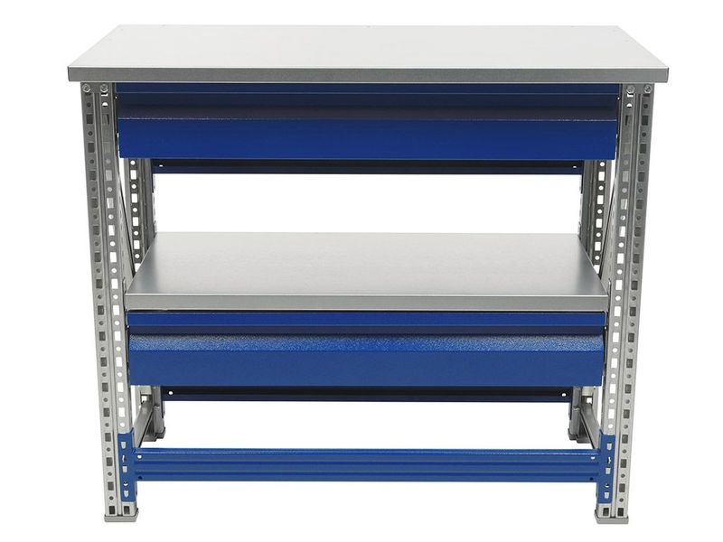- Возможность дополнить верстак полкой (нагрузка 100 кг) и выдвижным ящиком (нагрузка 30 кг).